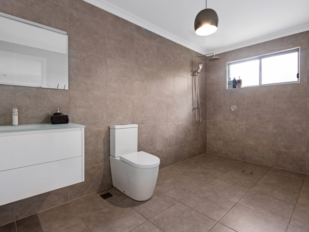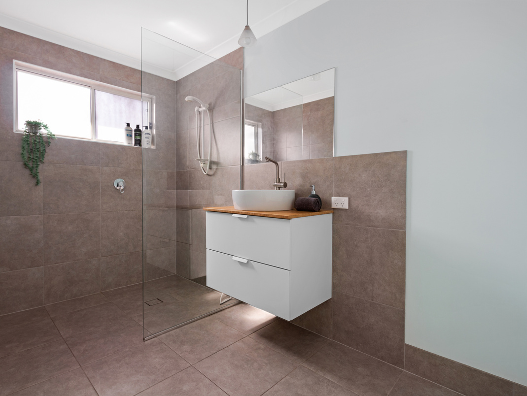 Purpose built for guests with mobility issues the ensuite has an open shower. All internal doors are 92cm wide & external doors from every room are sliding doors onto the patio that surrounds the house on all 4 sides. There are no steps at Pacific Pearl at all. From the driveway you can reach the wrap-around patio & the DLUG with no threshold.