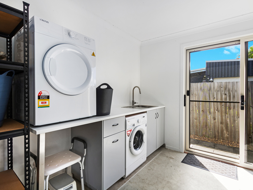 Double lock up garage, remote control roller door, shelving, brooms, vacuum cleaner, camping chairs, spare single camping bed, spare double air-mattress. Laundry with sink and front-loader washing machine, clothes dryer, laundry powder provided, clothes drying racks & pegs.