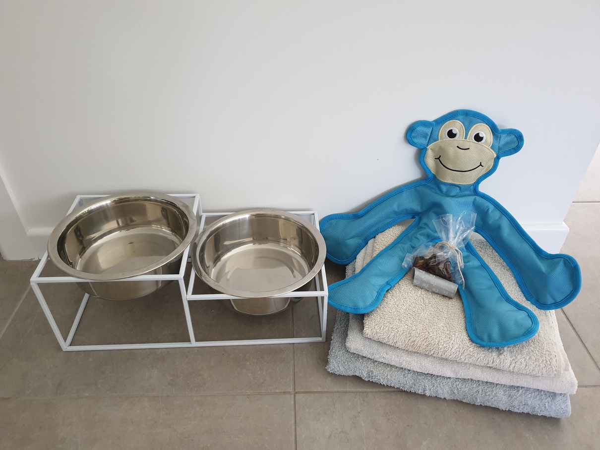 2 stainless steel dog food / water bowls, doggy towels, pooper scooper